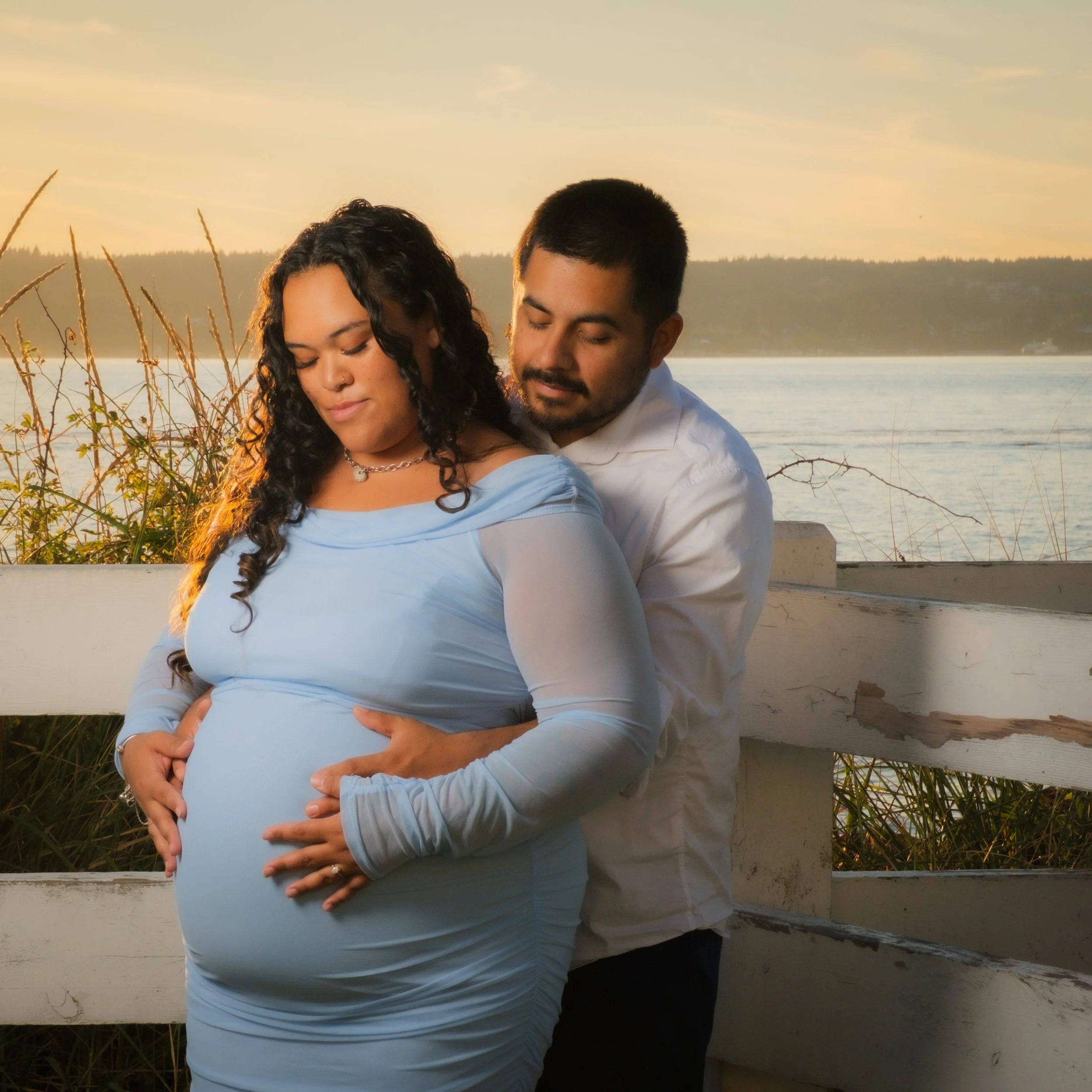 A smiling man and woman sitting close together on a concrete ledge by a body of water during sunset, with a cloudy sky and distant land in the background. View fullsize