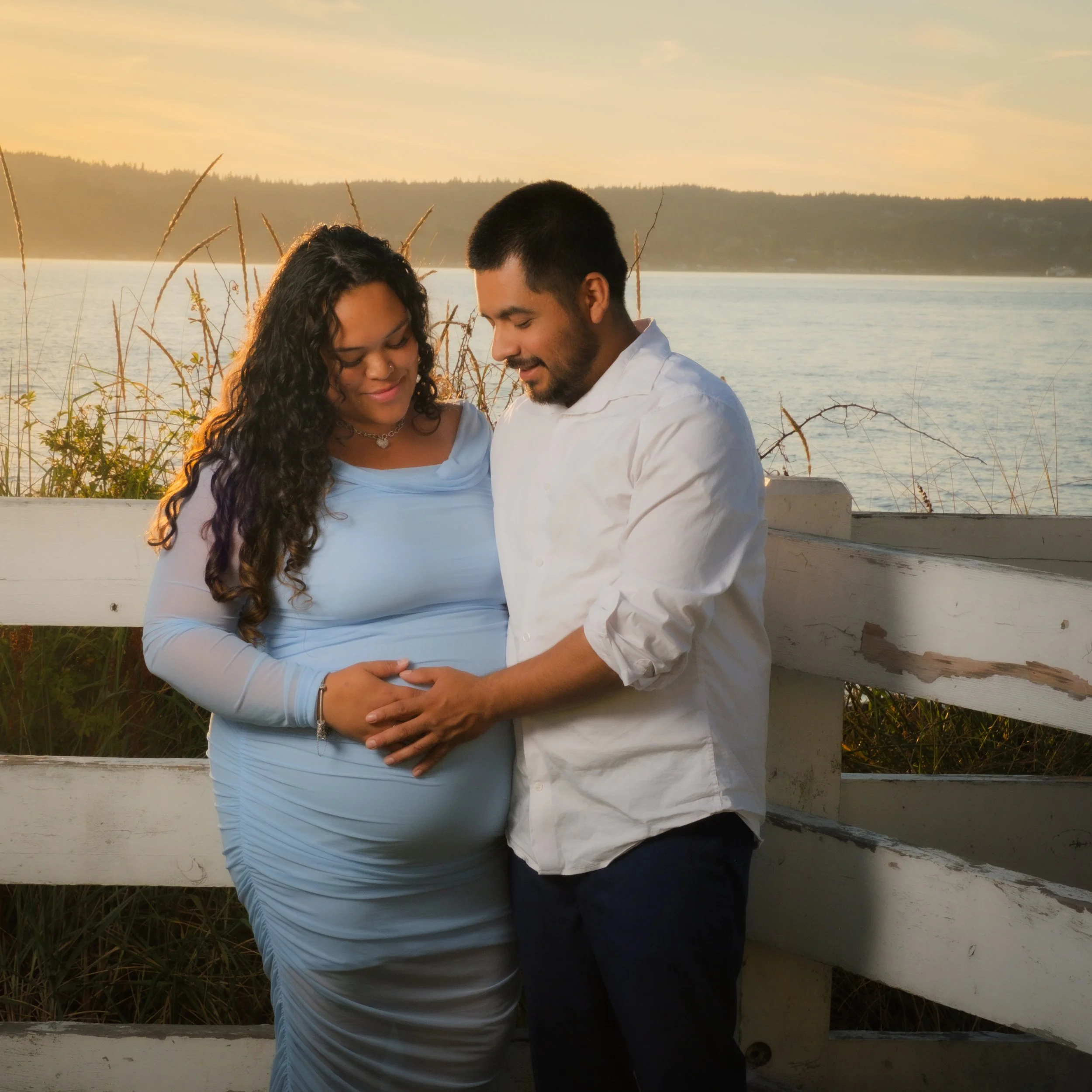 A couple sitting by the water, holding an ultrasound photo, with flowers in the foreground and cloudy sky in the background. View fullsize