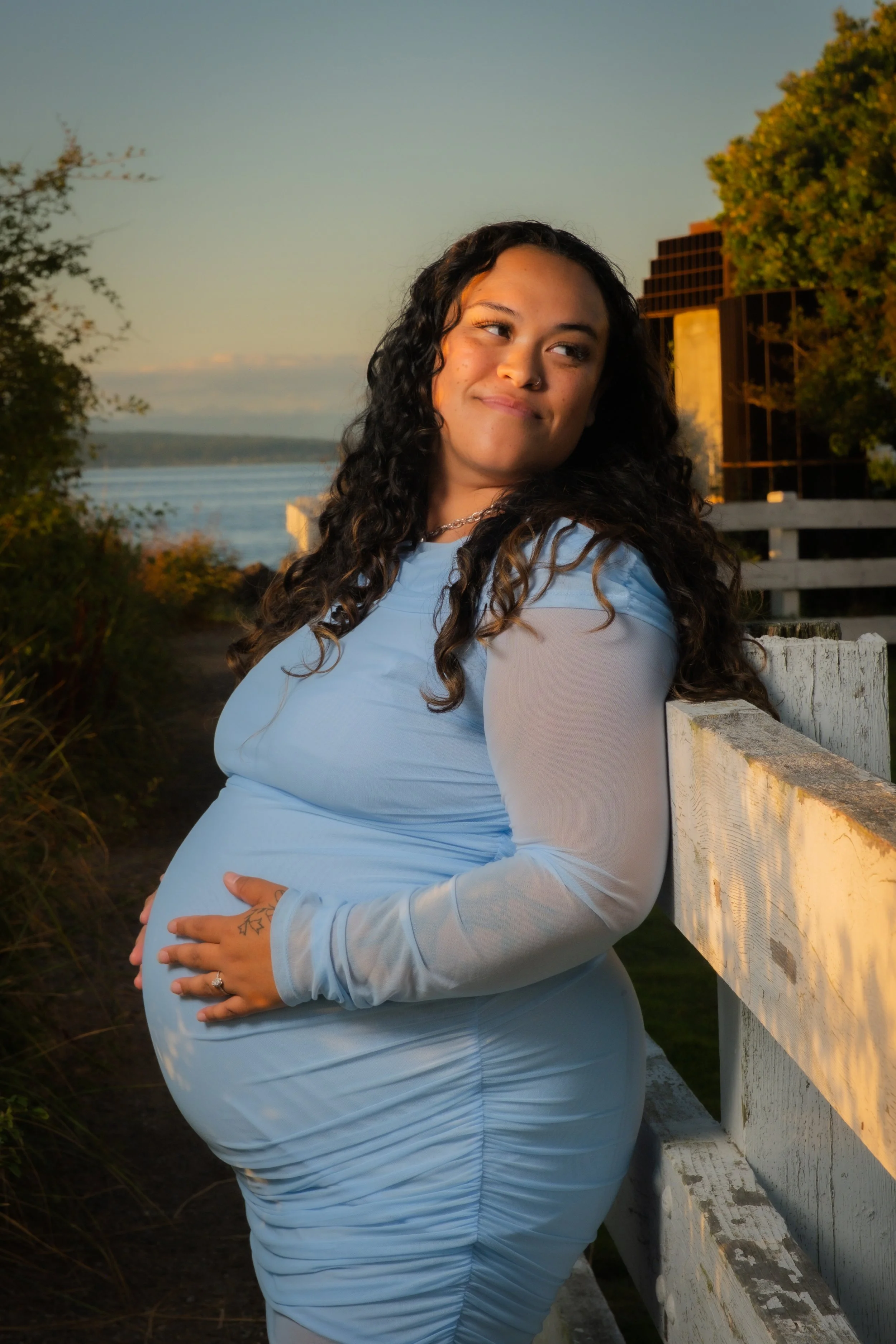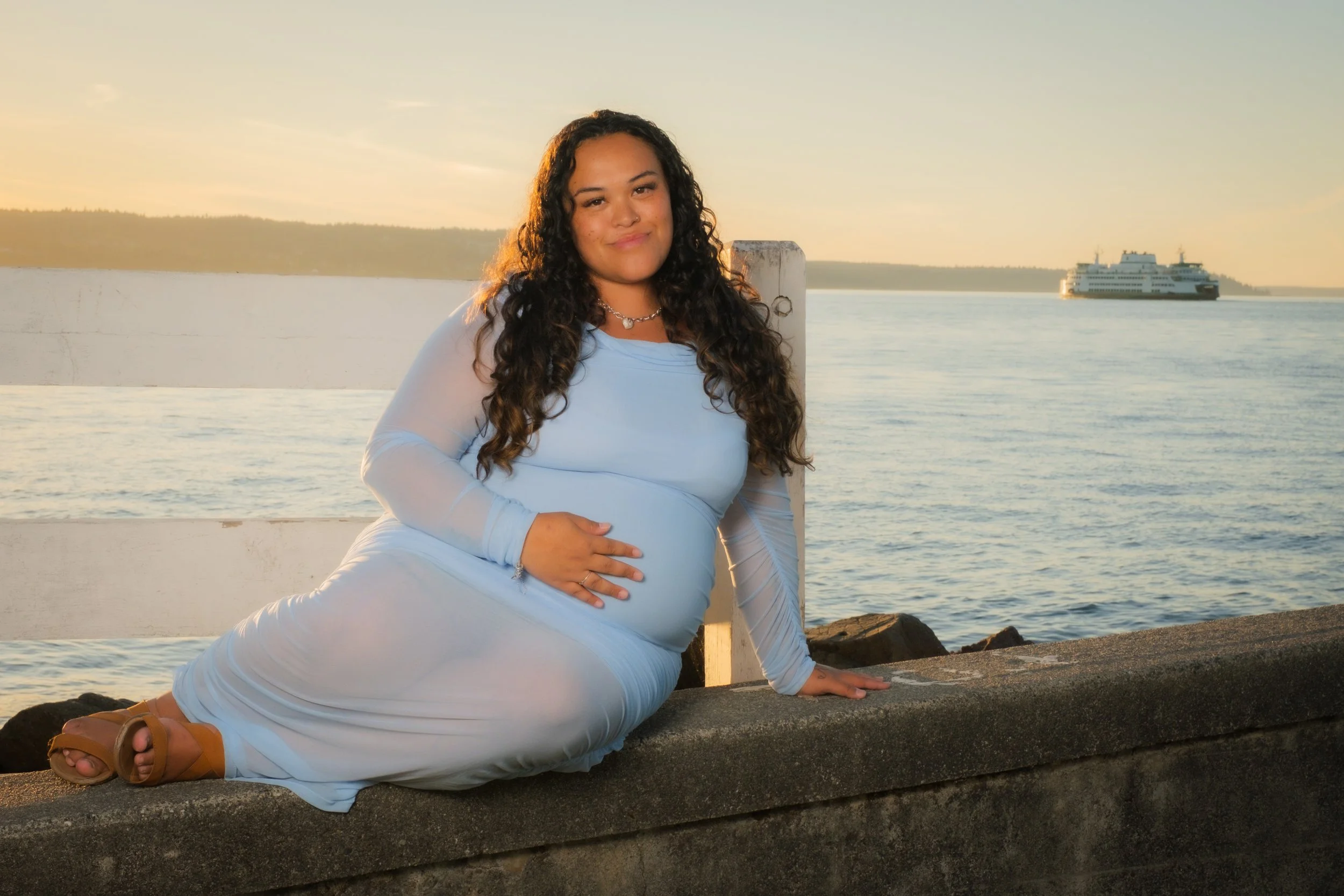 Young woman with curly red hair sitting by a body of water during sunset, wearing a light pink dress. View fullsize