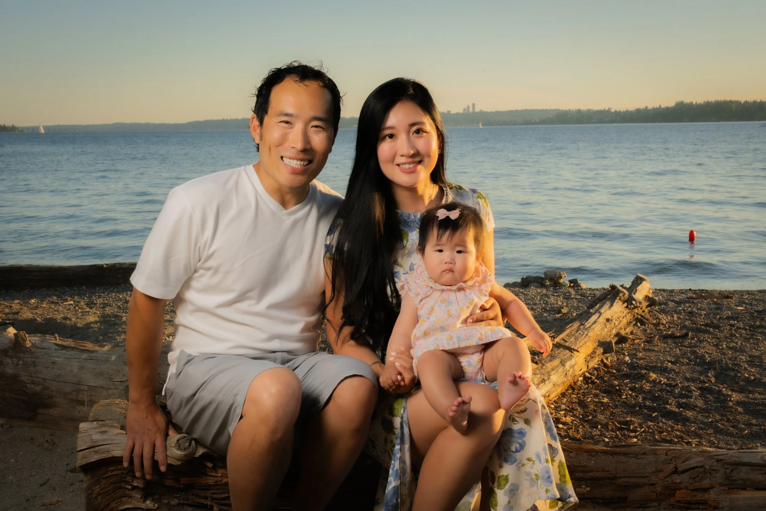 A happy family of three sitting on a large log on a rocky beach with green trees and cloudy sky in the background View fullsize