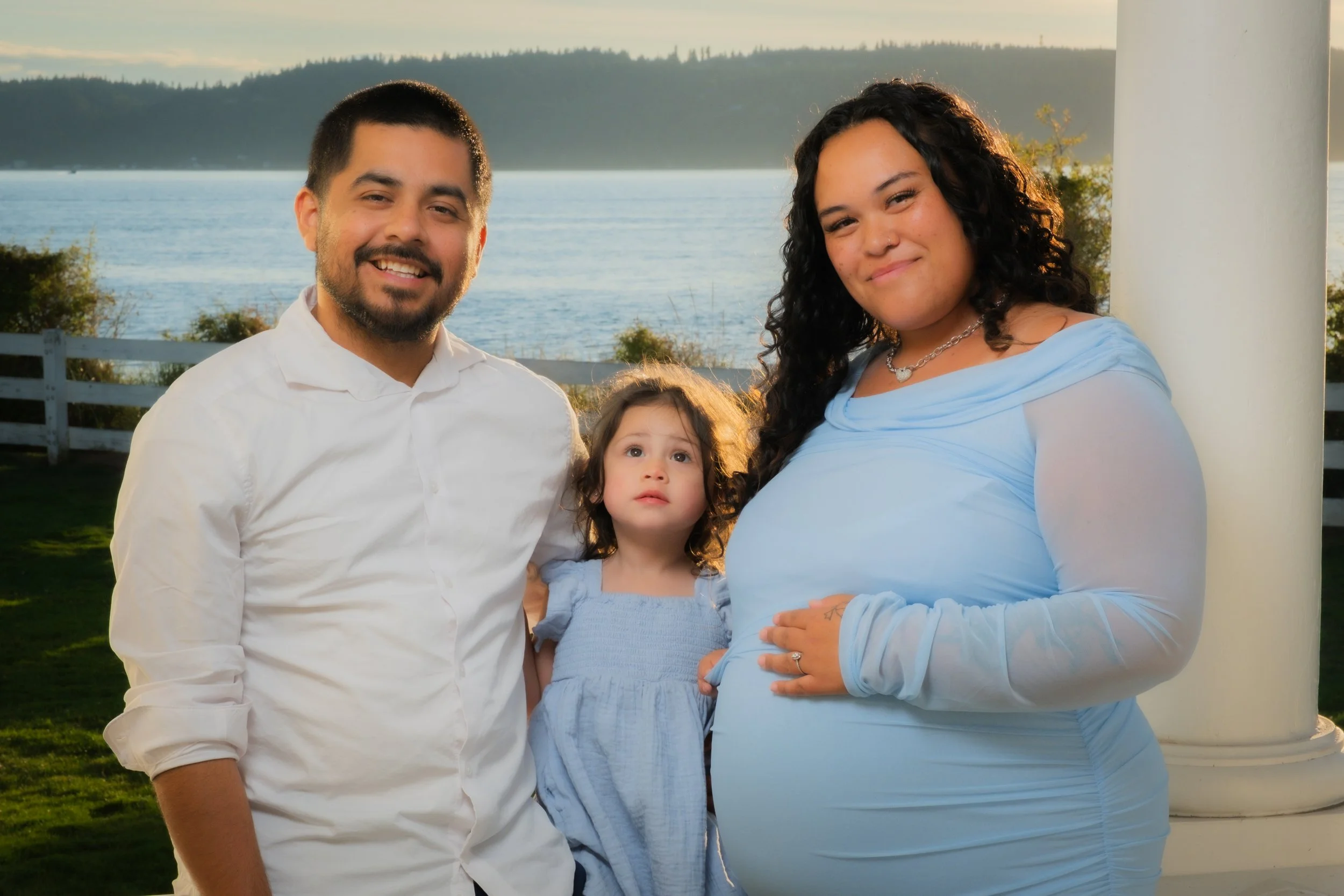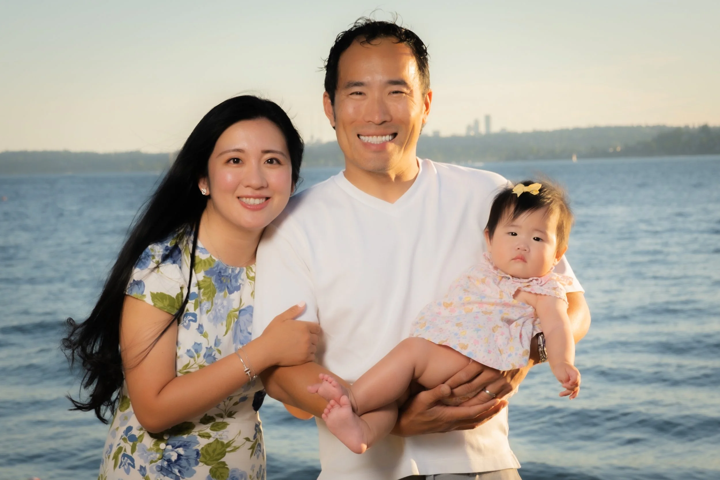 A happy family of three, a man, a woman, and a young child, smiling outdoors near a body of water with trees in the background.